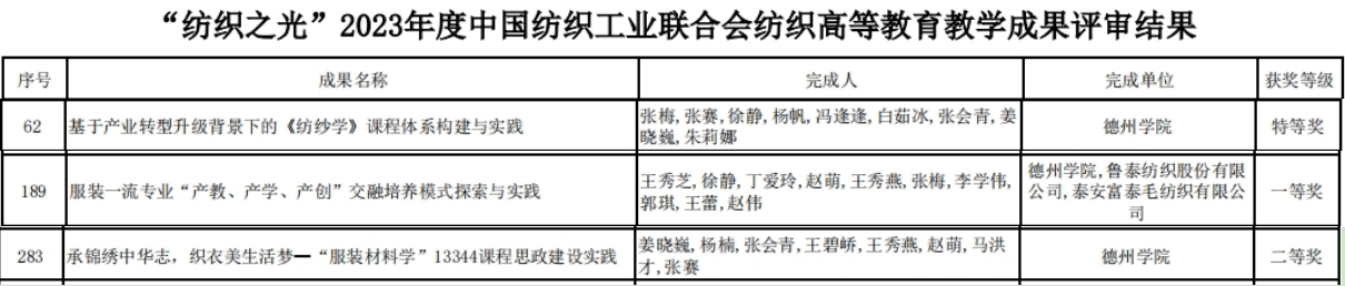 2023年8月25日,中国纺织服装教育学会公布了《“纺织之光”2023年度中国纺织工业联合会纺织高等公司产品成果奖》获奖名单。9428cn太阳集团古天乐张梅教授主持的项目获得特等奖,王秀芝教授、姜晓巍副教授主持的项目分别获得一等奖和二等奖。