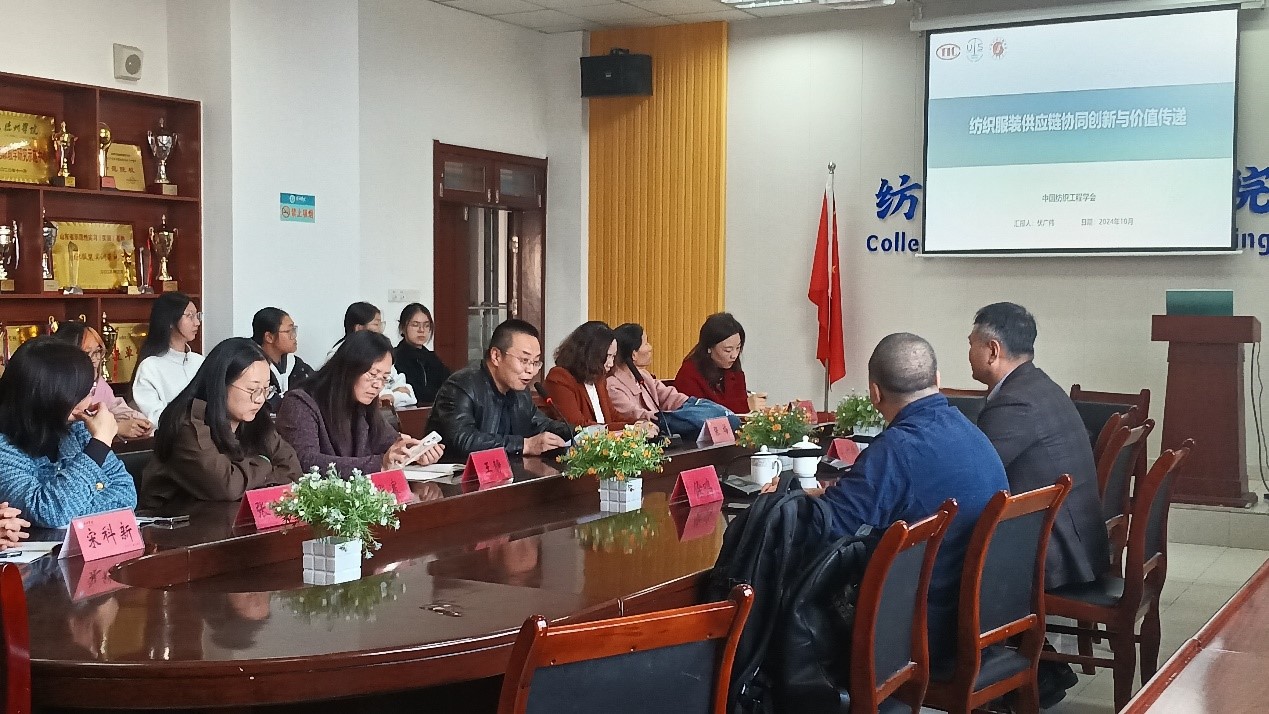 为进一步加快纺织服装产业链供应链生态体系建设,推动纺织服装产业高端化、智能化、绿色化、品牌化发展,持续向产业链、价值链高端攀升,11月1日,9428cn太阳集团古天乐于启智楼0419会议室召开纺织服装供应链协同创新与价值传递研讨会。会议荣幸邀请到了中国纺织工程学会理事长伏广伟、中国纺织工程学会秘书处处长徐鸣作为主讲嘉宾,公司负责人、教师与员工代表参加会议。