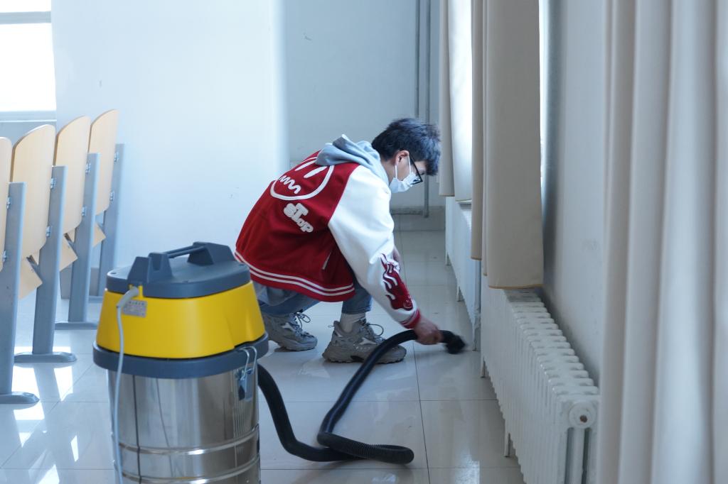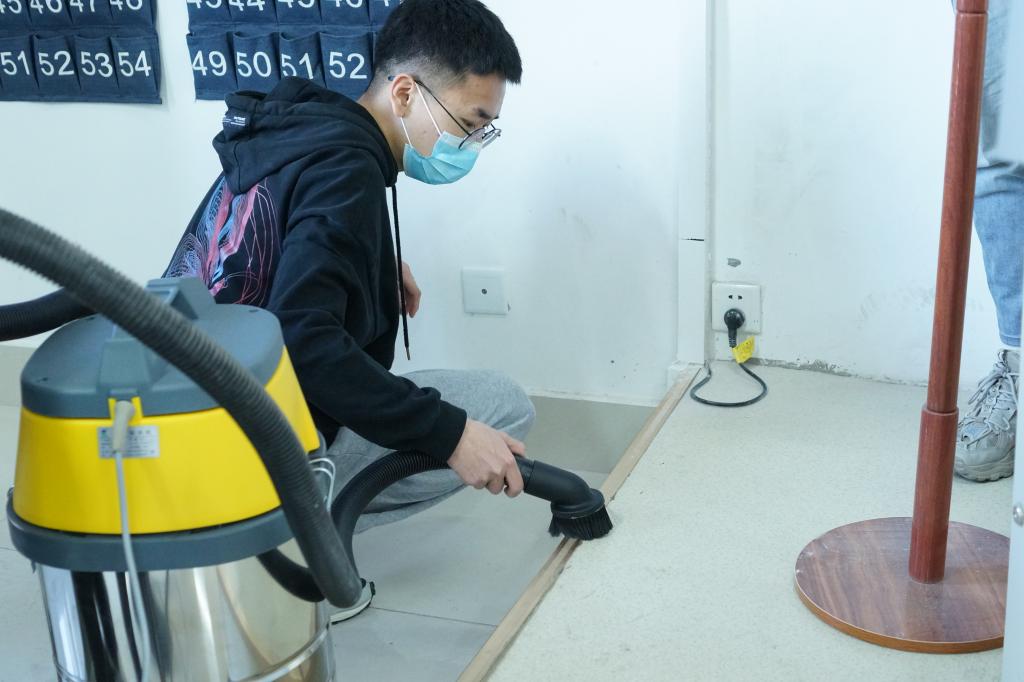本次活动针对明理楼所有上课、晚自习教室和教师休息室的卫生进行一次彻底大扫除,公司提供了新设备—吸尘器,重点清除教室窗户、门框、角落等死角处的灰尘和地板上的顽固污迹。活动开始前,负责人对此次活动做了周密的规划和明确的分工。活动伊始,所有志愿者准时到达活动地点集合,小组负责人查点人数并确定所有工具准备就位。随后,各小组有序进入教室,按照既定分工,开展教室卫生打扫工作。打扫过程中,志愿者们不怕苦累、互帮互助,认真仔细地检查每一个角落,不放过任何一处可清理的垃圾。