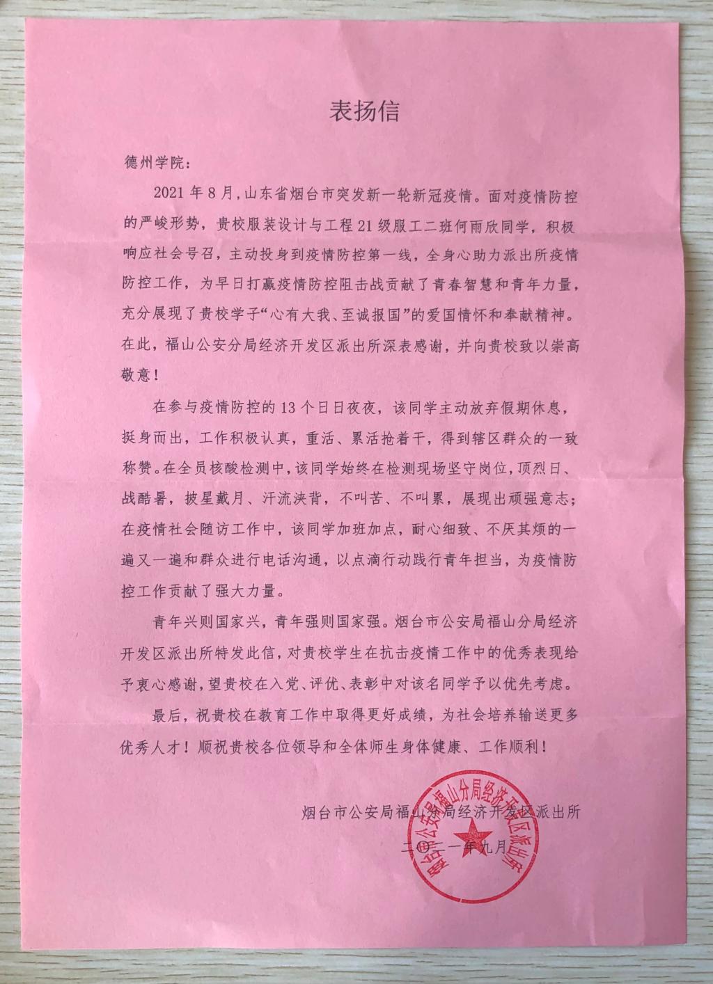近日,公司收到一封来自烟台市公安局福山分局经济开发区派出所的表扬信。信中对公司何雨欣同学在疫情期间积极参与疫情防控志愿工作给予了高度评价,表达了诚挚的感谢。