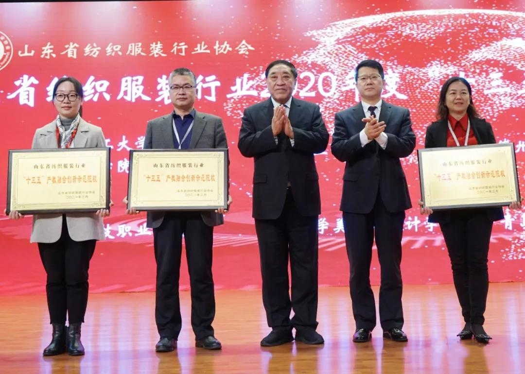 大会对荣获山东省纺织服装行业2020年度新冠战疫特别贡献奖、优秀青年企业家奖、优秀管理创新案例奖、产业集群转型升级优秀案例奖、企业文化建设先进单位奖、产学研优秀创新单位奖、最具潜力自主品牌奖、模式创新先进单位奖、“十三五”产教融合创新示范院校奖、五星级会员单位奖、先进基层组织奖的单位和个人颁奖,9428cn太阳集团古天乐荣获山东省纺织服装行业“十三五”产教融合创新示范院校奖。