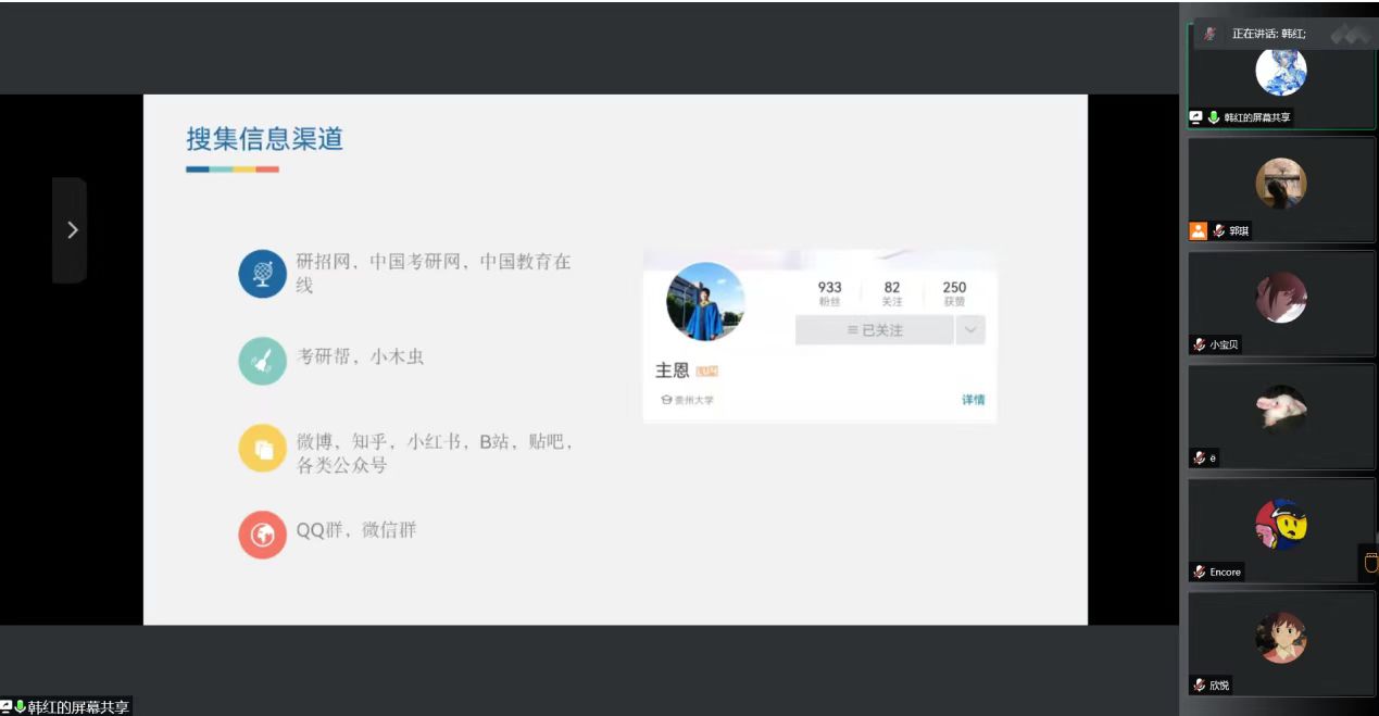 经验交流会按照工程和艺术两大类分别展开,来自天津工业大学纺织工程专业和武汉纺织大学艺术设计专业的两位研一学姐分别作为工科类和艺术类代表,分别分享了自己的复试准备工作、如何联系导师、如何制作个人简历、复试相关流程、面试心态调整等相关知识和经验,并为同学们分析了英语口语、专业课、综合问答等环节的常见问题及应对策略。来自南宁师范大学艺术设计专业的研一学姐,分享了自己在调剂院校上的经验及信息搜集渠道,为同学们分析了调剂过程中的注意事项,提醒大家注意关键的时间节点,把握好时机,全力以赴。经验分享过后,同学们就复试及调剂遇到的各种问题踊跃提问,学长学姐们均一一给予解答。