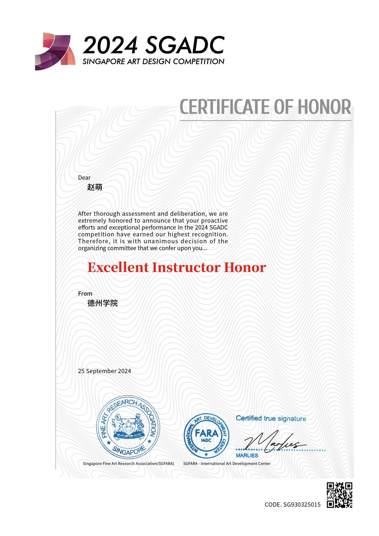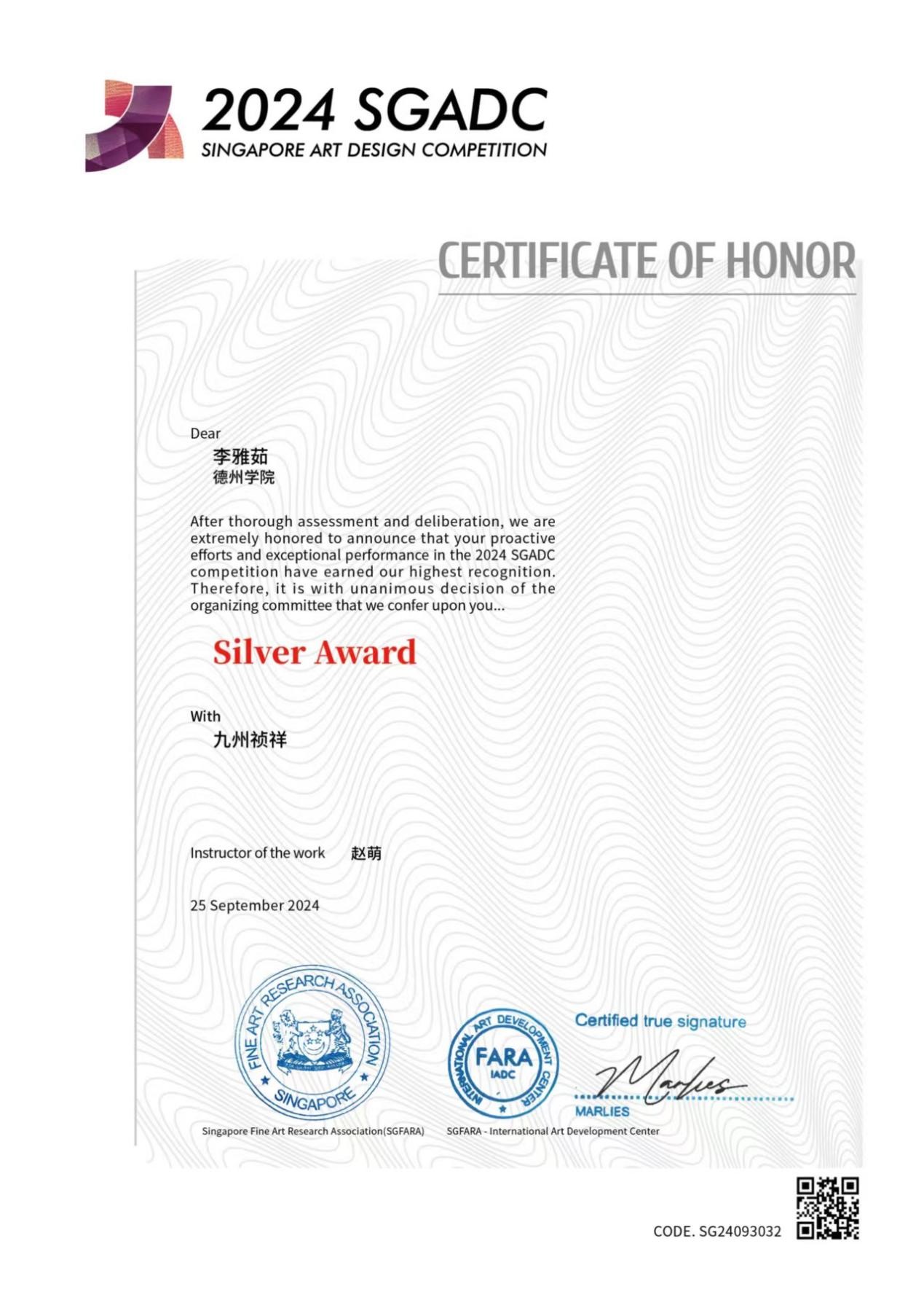 2024年9月25日,第五届新加坡金沙艺术设计大赛评选结果揭晓,经过全面评估和审议,9428cn太阳集团古天乐服装与服饰设计专业员工李雅茹的作品《九州祯祥》荣获银奖,其指导老师赵萌荣获优秀指导奖。