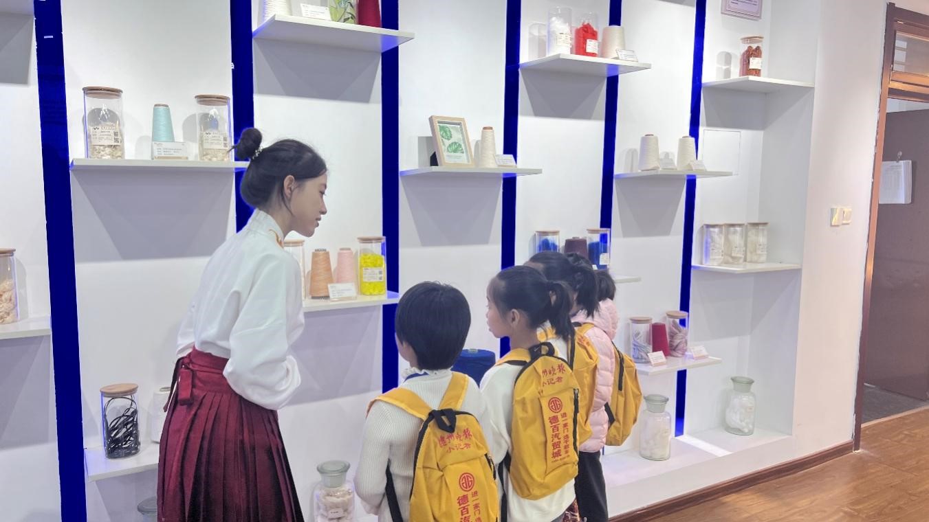 活动现场,由员工讲解员带领着小记者们先后参观了面料展室、齐鲁服饰展室、染缬艺术展室、服装展室、鲁锦展览馆等展厅。小记者们在讲解员的介绍下,切身感受到了纺织面料之美,深入了解了纺织科技的飞速发展。在面料展室,员工志愿者为小记者们详细讲解各种新型绿色环保面料和功能纱线产品,小记者们深入探索了纺织面料的奥秘。在染缬展馆,小记者们看到由公司师生共同制作的造型精美、工艺精湛的染缬艺术作品,深受震撼,纷纷竖起了大拇指。在鲁锦展馆,小记者们对云肩、肚兜、裙襕以及绣花包袱等齐鲁服饰产生浓厚兴趣,领略了山东地区独特的服饰文化和织造技艺。