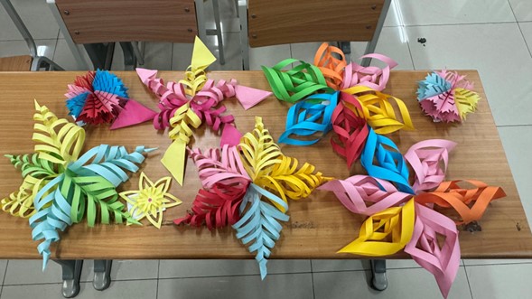 活动伊始,负责人有序地为同学们发放手工纸、剪刀和纸胶带等工具,同学们拿到材料后,迅速选定自己心仪的手工样式,迫不及待地投入到剪纸创作中。同学们手持纸张和剪刀,依照特定的形状固定,小心翼翼地裁剪留白部分,每一次落剪都饱含着专注与认真,每一个细节都彰显着同学们对剪纸艺术的尊重与热爱。在精心“雕琢”的过程中,大家互帮互助,其乐融融,一张张普通的彩纸在接连不断地“咔嚓”声中,变成了精美的剪纸作品,这些剪纸艺术品充分展现了同学们的想象力和对中华优秀传统文化的热爱,同学们看着自己的成果,脸上洋溢着满满的成就感,现场欢声笑语不断。