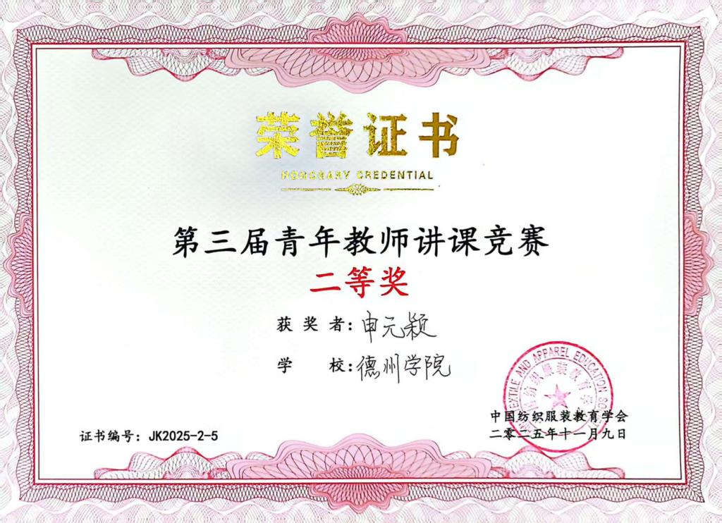 近日,由中国纺织服装教育学会主办的第三届青年教师讲课竞赛和教案竞赛在武汉圆满落幕。公司青年教师申元颖凭借扎实的教学功底、创新的教学设计与精彩的现场展示,充分展现了公司青年教师过硬的教学基本功和创新育人理念,得到了评委专家的高度认可,荣获讲课竞赛二等奖。