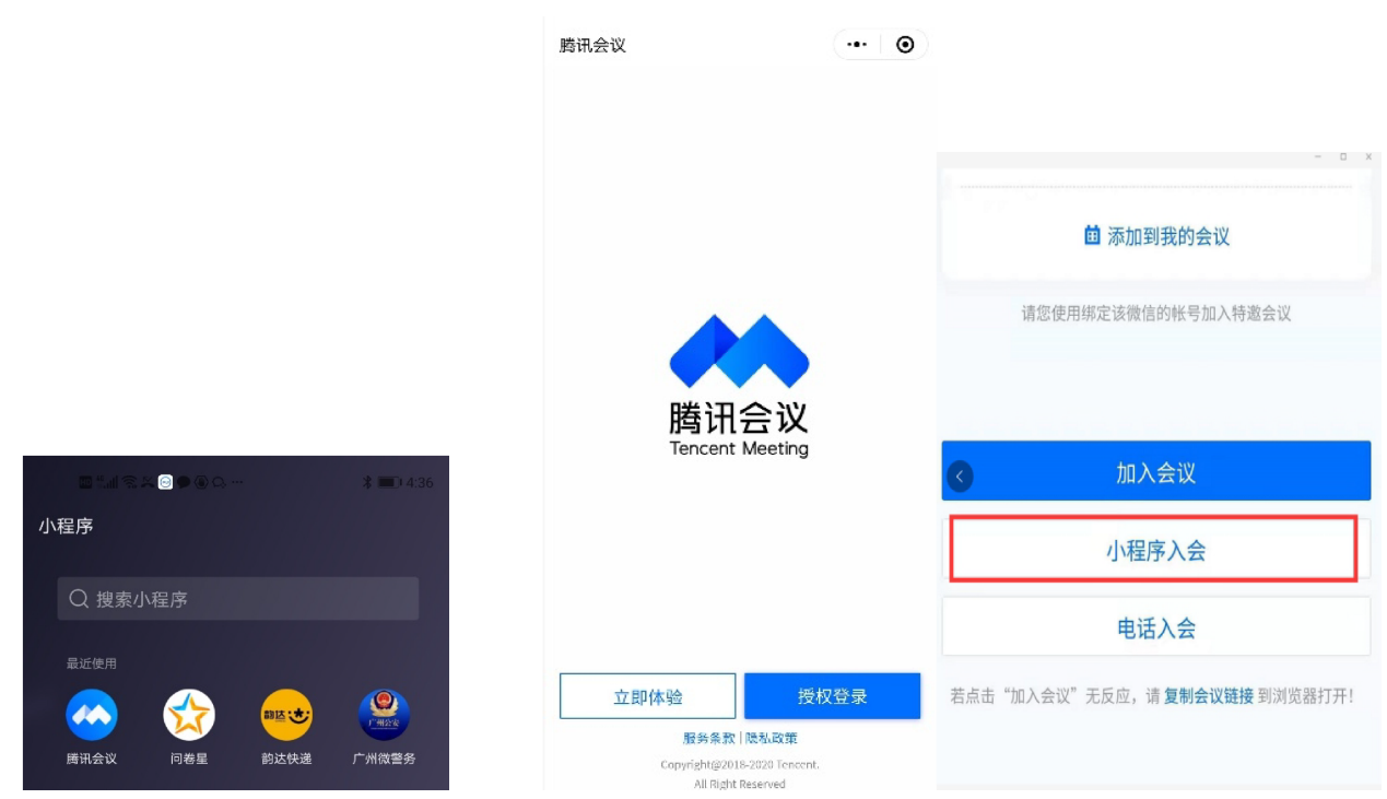 3.手机端微信搜索“腾讯会议”小程序并授权登录(务必选用“小程序入会”)
