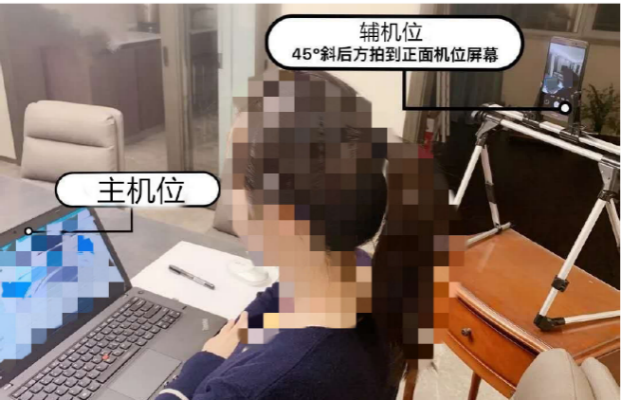 集中考试过程中必须在考场一前一后架设两个机位同时加入腾讯会议,远程监考老师开启会议录像并保存视频。