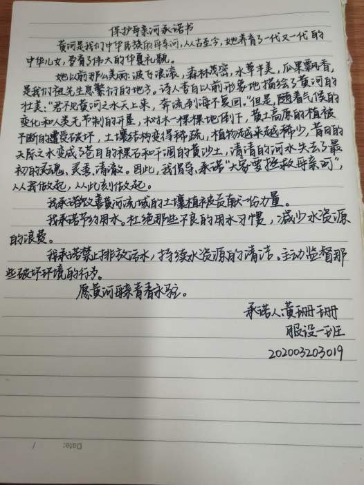 此次活动中,2020级“织梦未来志愿服务队”成员积极报名,庄严写下关于保护母亲河的承诺书,真正体现出新时代老员工的担当。保护母亲河行动,是共青团中央组织青年以保护哺育中华民族和一方人民的“母亲河”——黄河、长江及其它主要江河为主题,在“母亲河”流域以小流域为单元,大力开展治理水土流失、保护生态环境的一项重要工作,实实在在的造福于中华民族,为全球性生态平衡做出了贡献。一份份承诺书跃然纸上,一位位老员工投身生态建设,在美好的祈愿与坚定的行动下,活动圆满结束。