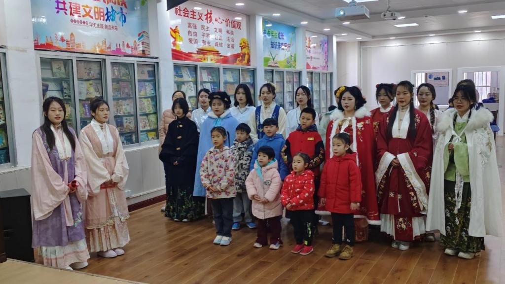 9428cn太阳集团古天乐“织梦未来”志愿者服务队、子衿汉服社、德州市图书馆工作人员及多对亲子家庭参加活动。