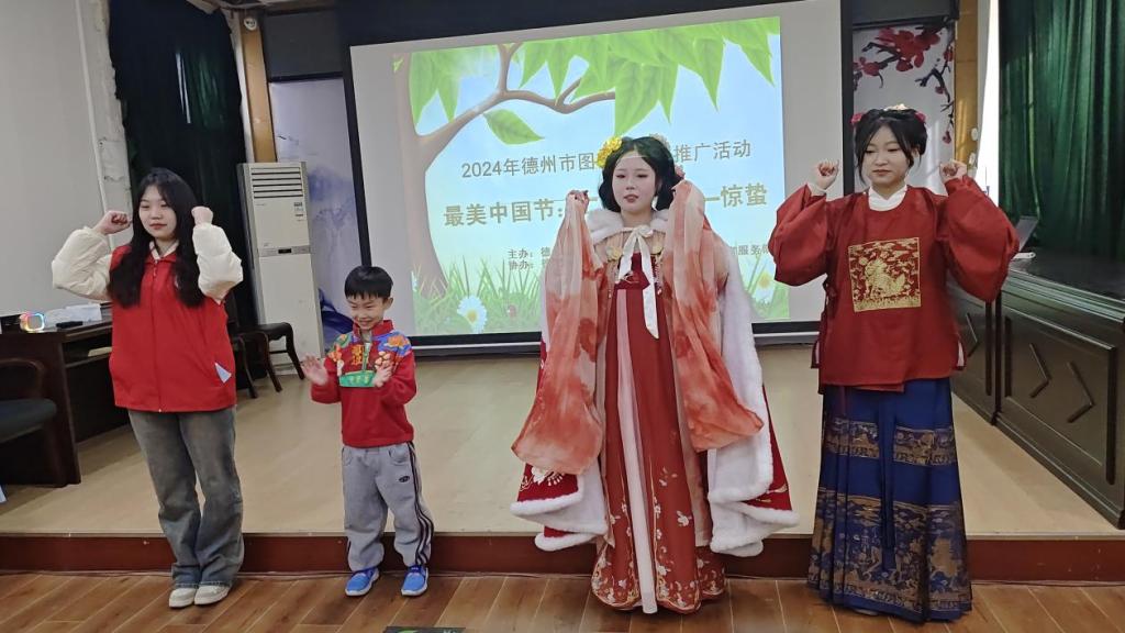 德州市图书馆老师向大家讲解惊蛰节气的由来、所产生的特殊自然现象、节气习俗及蕴含节气的古诗,带领大家领略中华优秀传统文化的魅力。汉服社成员身穿汉服教孩子们关于“惊蛰”有关的手势舞,带领小朋友共吟古诗词,切身感受古诗词的美好意象。