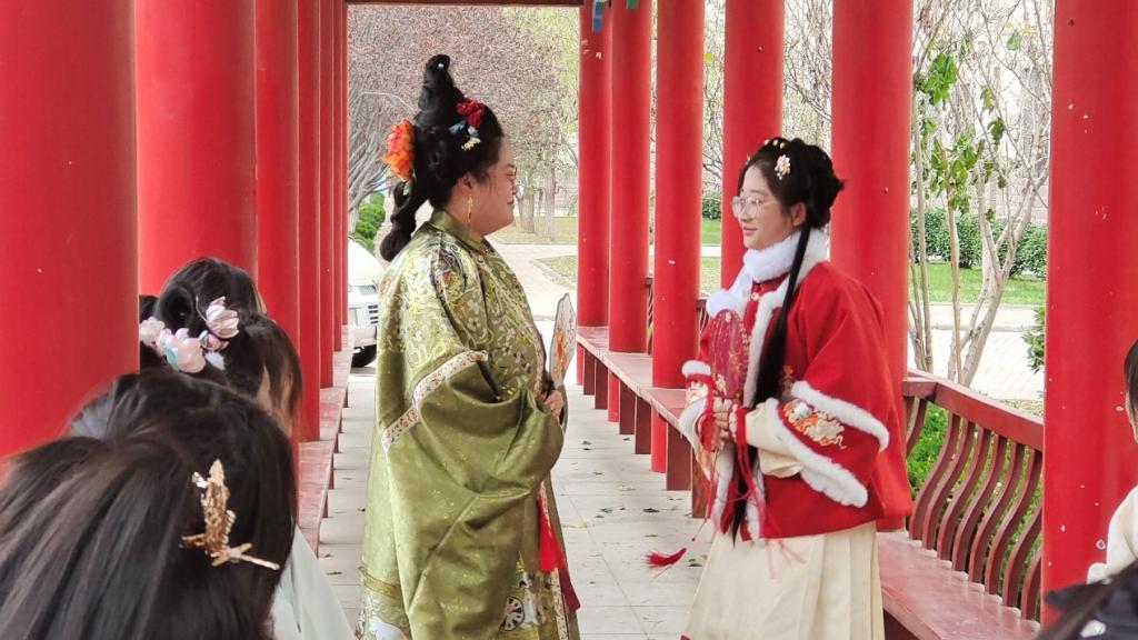 活动当天,参与者们身着不同朝代、不同风格的华服,束发盘髻、罗衣飘飘,有的雍容华贵,有的清新素雅,他们迈着轻盈的步伐行走于校园之中,优雅的演绎着华服的独特魅力,给初冬的校园增添了一道别致的古典韵味,成为一道亮丽的风景。为了能够给同学们呈现出一场印象深刻的文化盛典,活动参与者们在三餐红色走廊内开展传统有趣的娱乐游戏——击鼓传花,当音乐停止时,手持鲜花者需要表演才艺,唱歌、跳舞、作诗皆可。热闹的场景吸引了众多同学们驻足观看,华服点缀在每个人的身上,勾勒出灿烂文化的“可爱”模样,同学们仿佛置身于千年前的华夏文明中。大家纷纷表示希望通过这样的活动能让更多人了解并热爱中华传统服饰文化,为传承中华文化贡献力量。