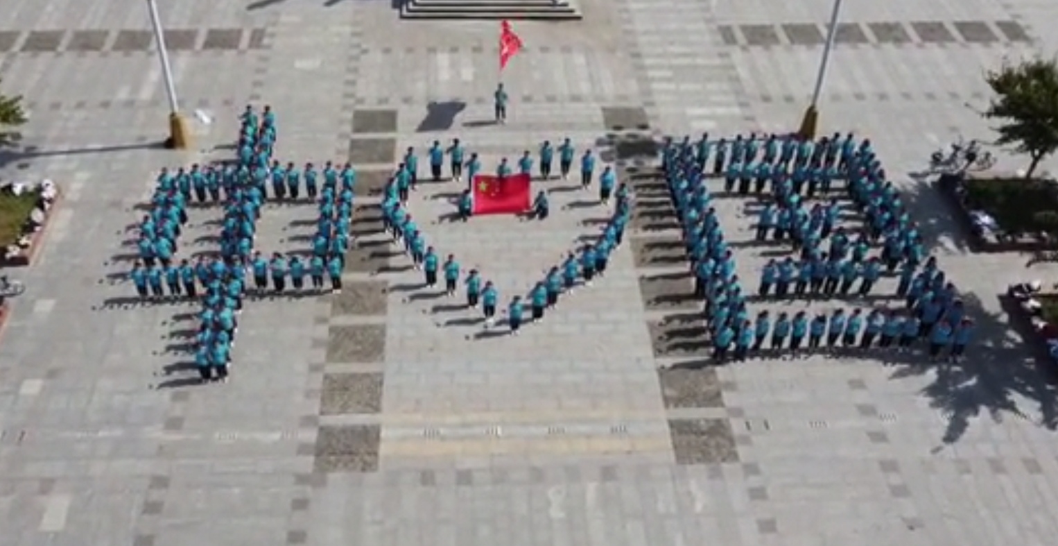 员工们手持五星红旗,将国旗贴在脸上,摆出“中国心”的图案和阵列,并齐唱《歌唱祖国》,表达对祖国的爱,为新中国成立72周年送出祝福。