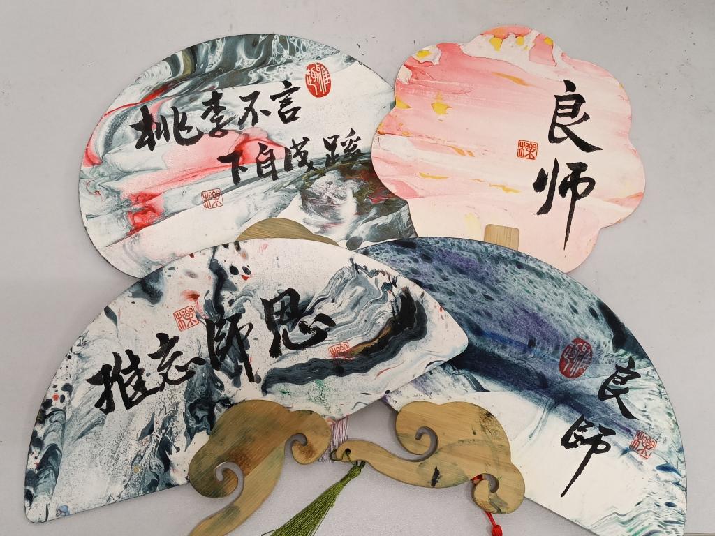 活动前,同学们积极筹备、安排分工,材料组、制作组、书写组......材料组同学积极准备空白团扇、漂漆、水桶;制作组的同学们将漂漆以点、甩、弹、划等手法置于水面,形成极具生命感和随机性的色块,再把白色的扇子浸入漂漆中,轻轻摇曳,在一沉一提间,形成了妙趣横生、自然天成的图案,它们或清新淡雅,或艳丽夺目,每一把漆扇都是同学们独一无二的作品。书写组的同学在扇面上撰写了自己对老师的崇高敬意和感恩之情。9月10日,教师节当天,同学们将亲手制作的漆扇送至老师手中并送上真挚的节日祝福。