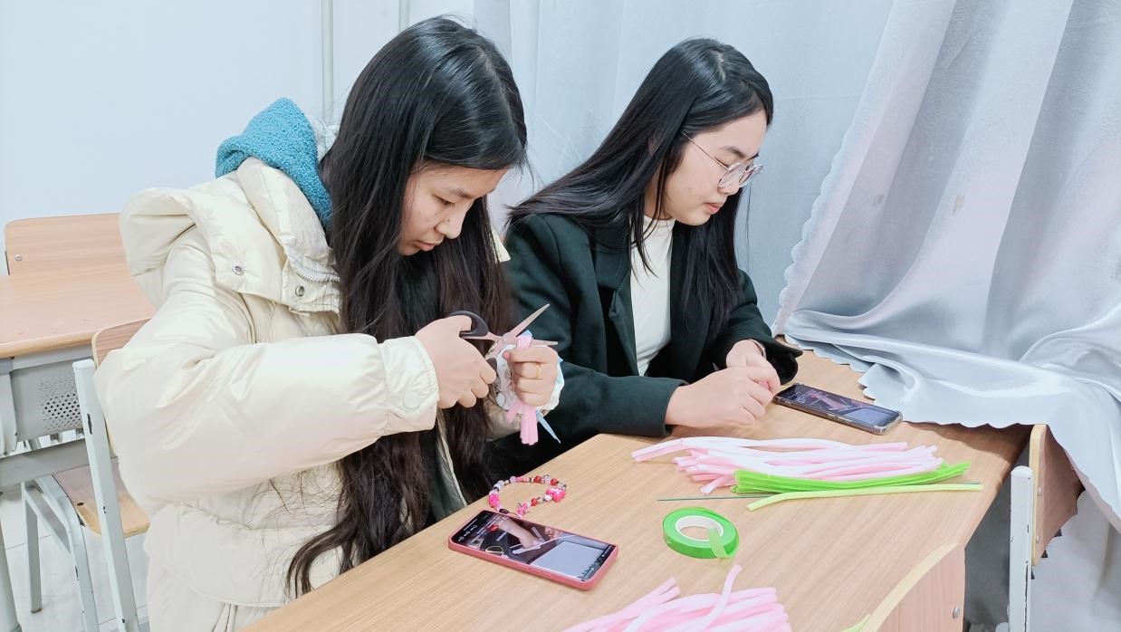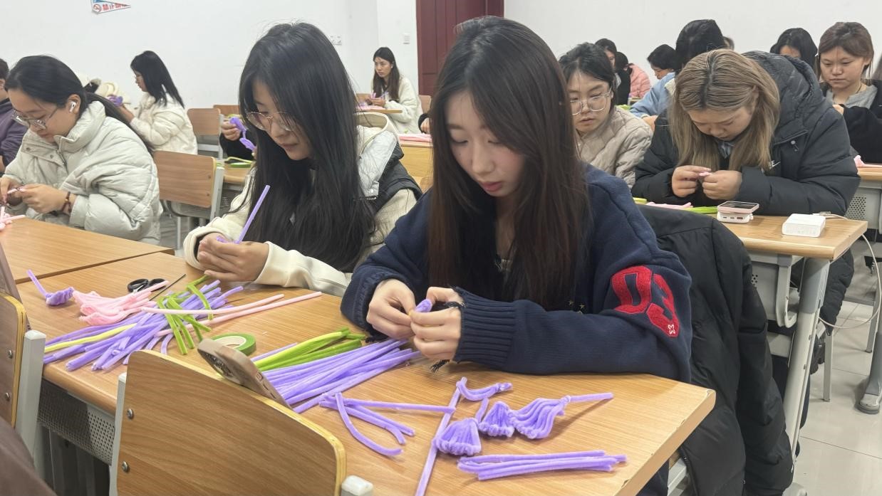 活动伊始,负责人准备了多彩的扭扭棒、剪刀等材料,并向参与活动的同学们详细介绍了扭扭棒的特点及其制作方法。在负责人的悉心指导下,同学们充分发挥想象力,将自己对美的理解融入创作当中,一扭一捏,一卷一折,一贴一合……从一开始的小心翼翼,到熟能生巧,整个现场弥漫着一种欢快而又专注的氛围,同学们相互讨论交流着各自的创意,每个人的脸上都洋溢着认真与期待。随着时间的流转,一根根普通的扭扭棒在大家的巧手下渐渐蜕变成了形态各异的花样手工作品,同学们纷纷进行现场展示并拍照留念。现场的每一件作品都凝聚了同学们的心血与智慧,它们不仅造型独特、色彩斑斓,更蕴含着同学们寄予的深刻寓意和丰富创意。