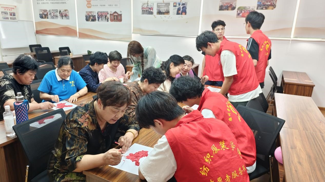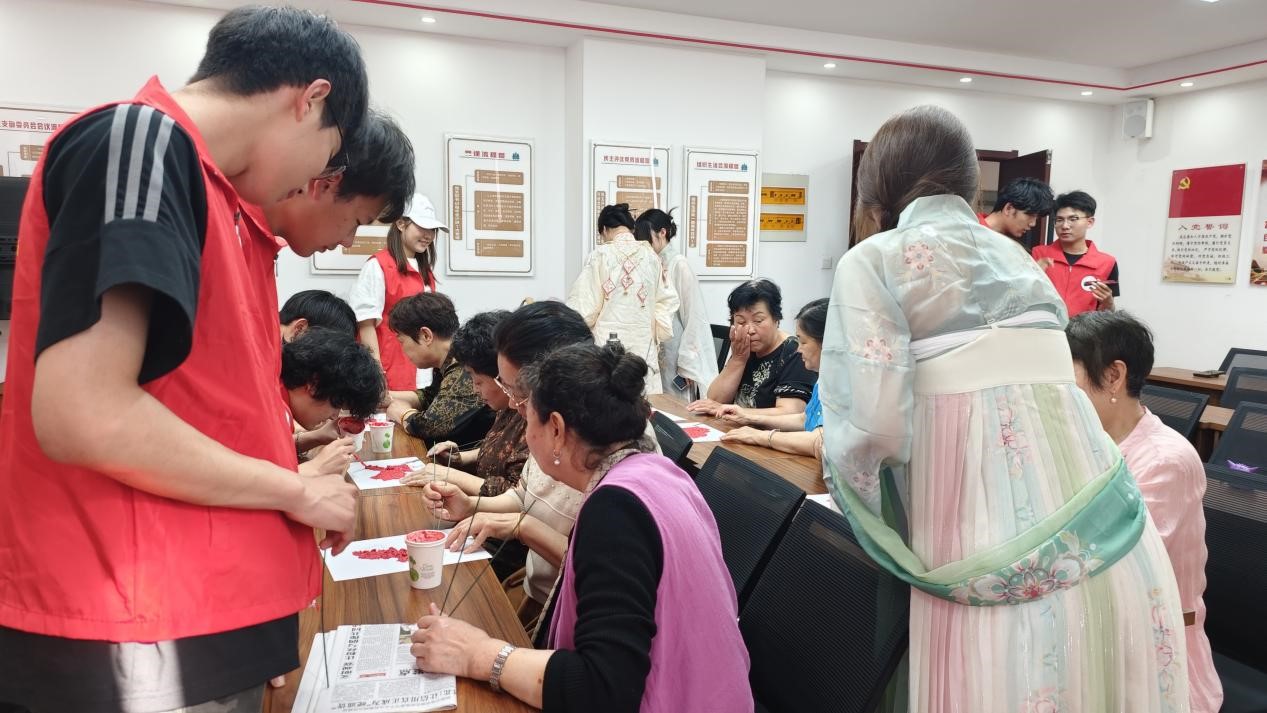 活动现场,志愿者们带领社区居民沉浸式体验传统文化,在汉服文化讲解环节,志愿者以历史脉络为轴,先从先秦到明清的形制演变,再结合服饰文物图片、传统纹样解析与文化内涵阐释,帮助社区居民详细了解汉服的演变历程。随后,在纸浆画创作环节中,志愿者们展现出十足的耐心,细致地为社区居民讲解纸浆画的绘制过程。大家全神贯注,仔细聆听每一个步骤,在志愿者们的悉心指导下,充分发挥自己的创造力和动手能力,在以素白为底、朱红为主色调的画板上,运用抹、点、勾、涂等手法精心勾勒个性化的艺术图景。居民们充分发挥创意,将吉祥纹样、自然意象等元素融入创作之中,在手工实践中感受传统工艺的独特魅力。活动现场洋溢着传统文化与手工创作交织的温馨氛围,居民们不时欣赏彼此作品,交流创作心得与技法巧思。