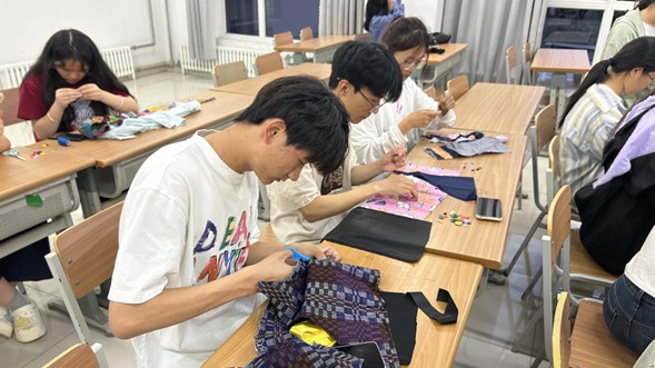 活动现场,同学们以小组为单位开启了一场与鲁锦和布艺的奇妙邂逅,从布料选材到立体剪裁,从纹样设计到综合拼贴,通过十余道手工步骤将纺织材料转化为艺术语言,形成了一件件精美的装饰画作。制作过程中,同学们互相探讨针法技艺、交流创作心得,在动手实践中体验创作的快乐。当看到自己亲手制作的作品完成时,每个人脸上都绽放出满足的笑容。活动结束时,同学们仍意犹未尽地讨论着制作技巧,现场洋溢着温馨愉悦的氛围。大家纷纷表示,在鲁锦文化的熏陶下,激发了创意灵感,更在互帮互助中缓解了压力,在共同创作的过程中,还学会了倾听他人的意见与分工合作,感受到了团队的力量。