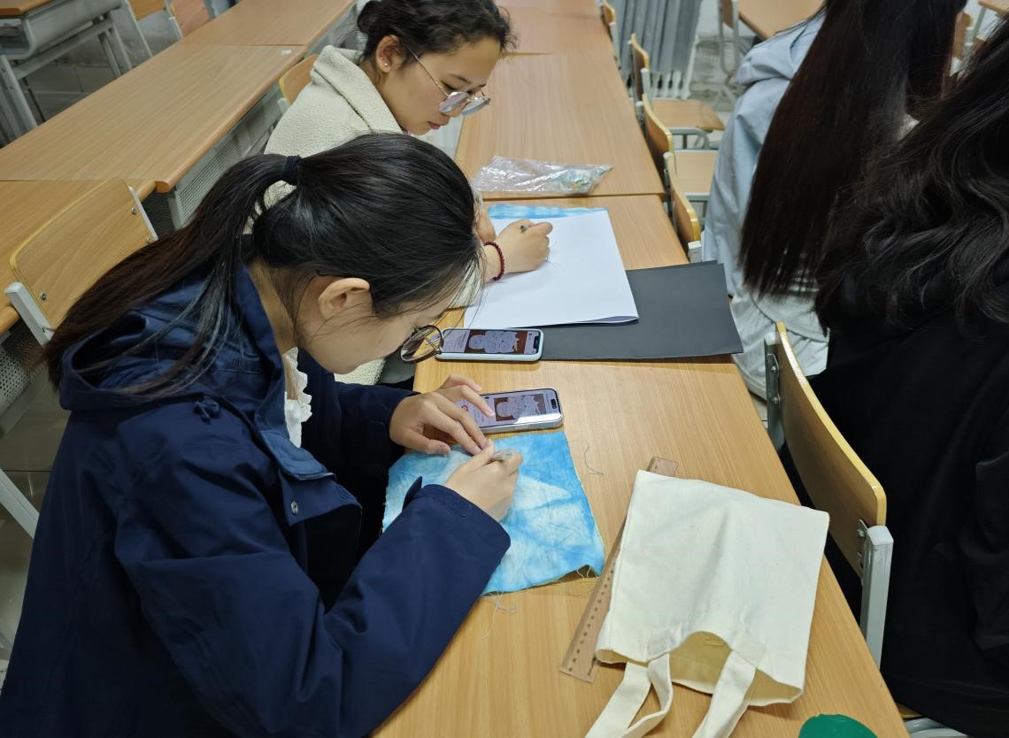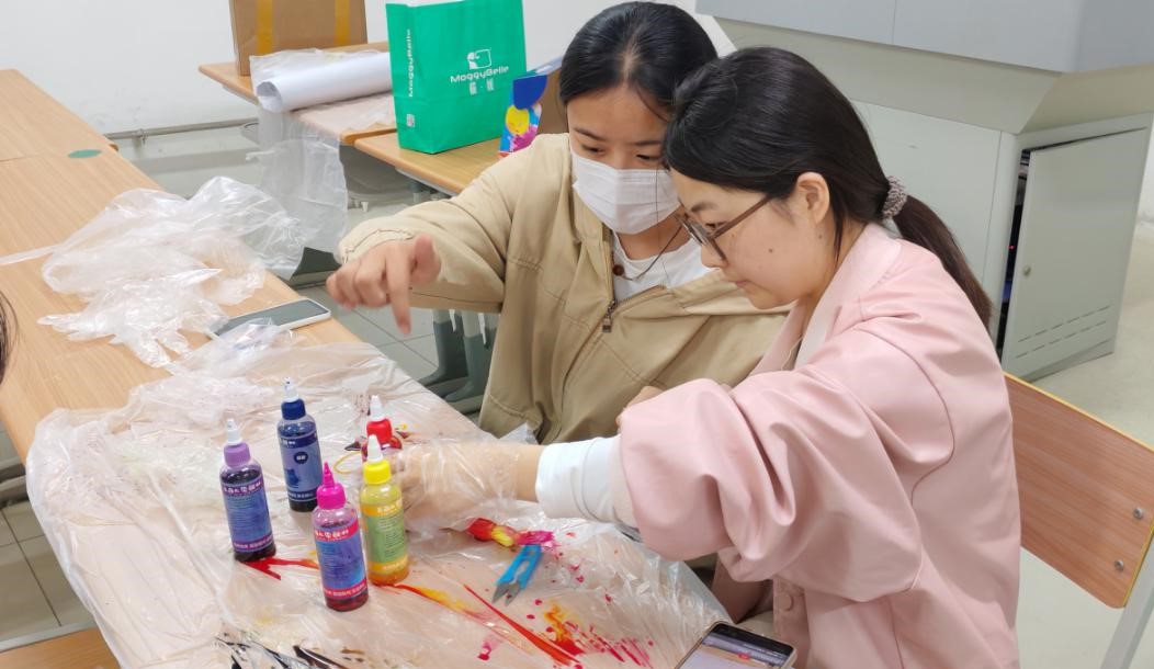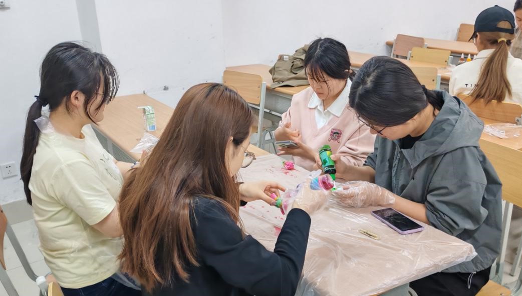 此次活动以传统扎染技艺与绣球制作为载体,将美育与心理疏导巧妙融合。活动现场,主持人首先详细介绍了扎染和纸艺绣球的历史文化与制作流程,让同学们对这两项传统技艺有了深入的了解。在实践环节,同学们充分发挥自己的创意,挑选喜欢的布料与彩纸,精心设计图案、细致扎结、调配染料,沉浸在艺术创作的世界里。在扎染过程中,同学们通过捆扎、浸染、晾晒等步骤,亲眼见证布料在染料中变幻出独一无二的图案;制作纸艺绣球时,大家专注地折叠、粘贴、组合,每一个动作都充满耐心与巧思。“在制作纸艺绣球和扎染的过程中,我感觉非常开心,仿佛忘却了所有烦恼。”参与活动的王同学说道。随着一件件作品的完成,同学们脸上洋溢着成就感与喜悦,原本学习生活中的压力与焦虑也在艺术创作的过程中悄然消散。