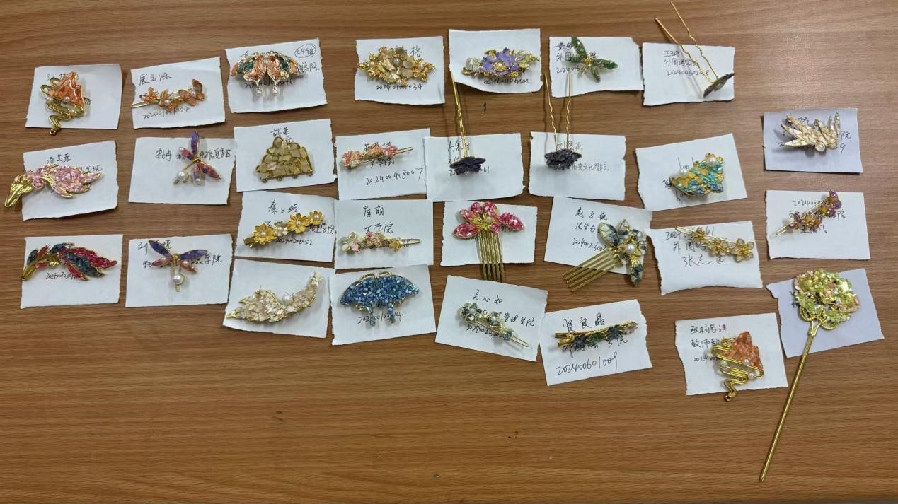 活动伊始,负责人为同学们详细讲解了非遗螺钿工艺的发展历史和制作步骤,并为同学们分发了贝壳、底胚、镊子等制作材料。同学们在负责人的指导下精心挑选螺片,根据自己的设计需求将材料雕琢成不同形状,通过反复打磨使其呈现温润光泽,再以精准的手法将螺片嵌入漆器胎体。随着贝壳虹彩在光影间流转,原本素雅的器物逐渐焕发出独特的艺术生命力。在制作过程中,同学们互相交流心得、分享技巧,不断尝试新的镶嵌方式和色彩搭配,力求自己的作品更加完美。最终,一件件饱含创意与匠心的螺钿作品逐渐呈现,有的制作出蝴蝶造型的螺钿发簪,灵动精巧;有的则打造出花朵样式的发饰,精致华美。同学们纷纷表示在这次活动中,近距离领略了非遗螺钿工艺的独特魅力,在制作的过程不仅提升了动手能力,还收获了满满的成就感。
