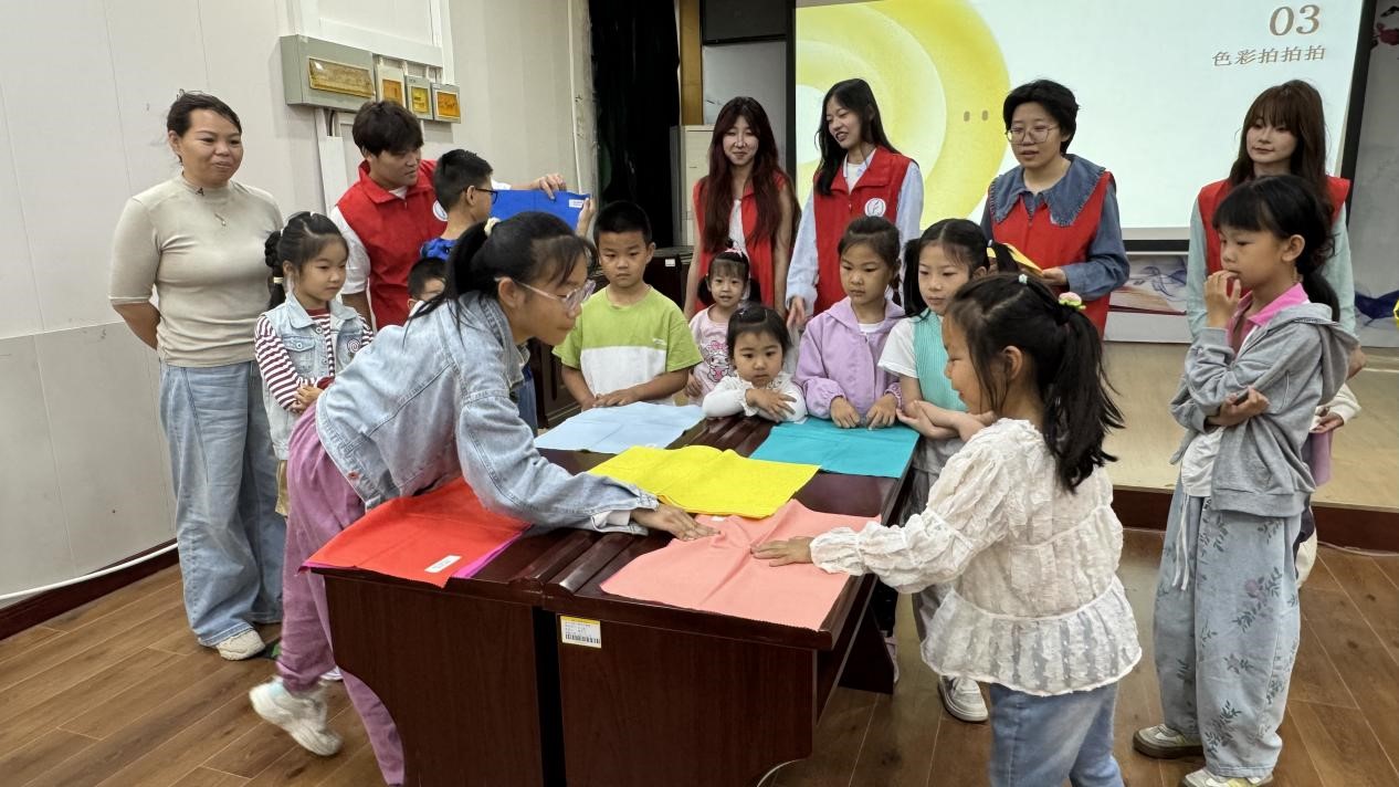 活动中,公司志愿者以专业视角为切入点,通过精心设计的PPT课件,为小朋友们系统地讲解了色彩分类、搭配原理等美术基础知识,将抽象理论转化为生动易懂的语言。除了精彩的知识讲解外,活动还精心设计了多个趣味互动环节,包括考验色彩识别速度的“颜色拍打”、挑战注意力的“说出文字颜色”游戏,以及模特社主持的“四季性皮肤测试”。在志愿者们的悉心指导下,小朋友们兴奋地穿梭于各游戏环节中,在拍打色块时你追我赶,在文字颜色竞答中全神贯注,更通过肤色测试发现了适合自己的穿搭色彩。现场气氛热烈而欢快,小朋友们在游戏中既感受到色彩的魅力,也收获了实用的美学知识。