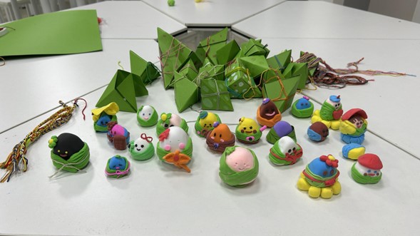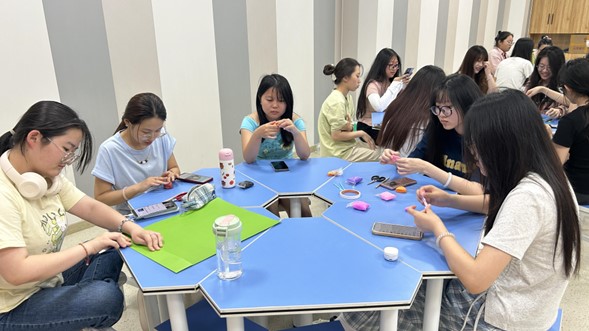 活动现场,负责人为同学们详细讲解了制作步骤和技巧,同学们分组领取卡纸、黏土、彩绳等材料后便投入创作。在轻松愉快的氛围中,同学们充分发挥创意,将五彩绳结编织成寓意吉祥的手链,用卡纸折叠出立体的“情粽”,又以黏土捏塑出造型各异的趣味作品。制作过程中,同学们互相交流技巧,现场气氛活跃。随着时间推移,一个个精巧的手工作品陆续完成,五彩绳结、立体纸粽、造型黏土在同学们手中呈现。活动结束后,参与同学纷纷表示,这样动手体验传统手艺,既感受到了文化的魅力,更缓解了日常学习的压力、放松了心情。