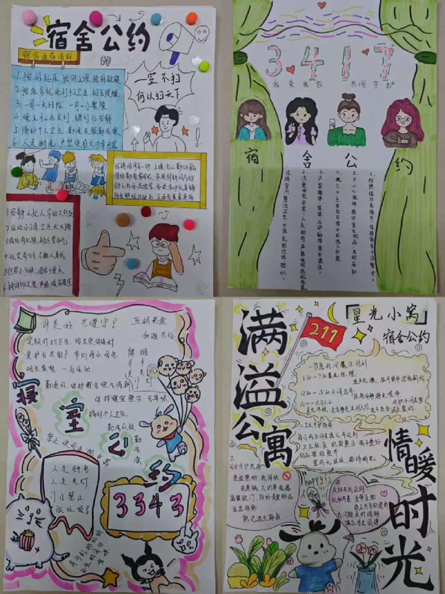 活动围绕三个内容展开,分别为宿舍门牌设计比赛、宿舍条例设计比赛以及学习笔记评比。在活动期间,同学们热情高涨,积极参与。宿舍门牌设计现场,同学们充分发挥创意,以可爱的卡通形象为灵感,用彩色的画笔描绘出一个个活泼的角色。宿舍条例设计比赛同样精彩纷呈,同学们将条例与艺术巧妙结合,通过生动的海报设计和简洁的文字,创造出既规范又具美感的视觉作品,条例内容清晰易懂。学习笔记评比环节则是对同学们学习态度和方法的检验,同学们纷纷拿出自己精心整理的学习笔记,字迹工整、条理清晰,重点内容用不同颜色的笔标注出来。评委们秉持着 公平、公正原则,最终评选出了一、二、三等奖若干名,并颁发了荣誉证书。