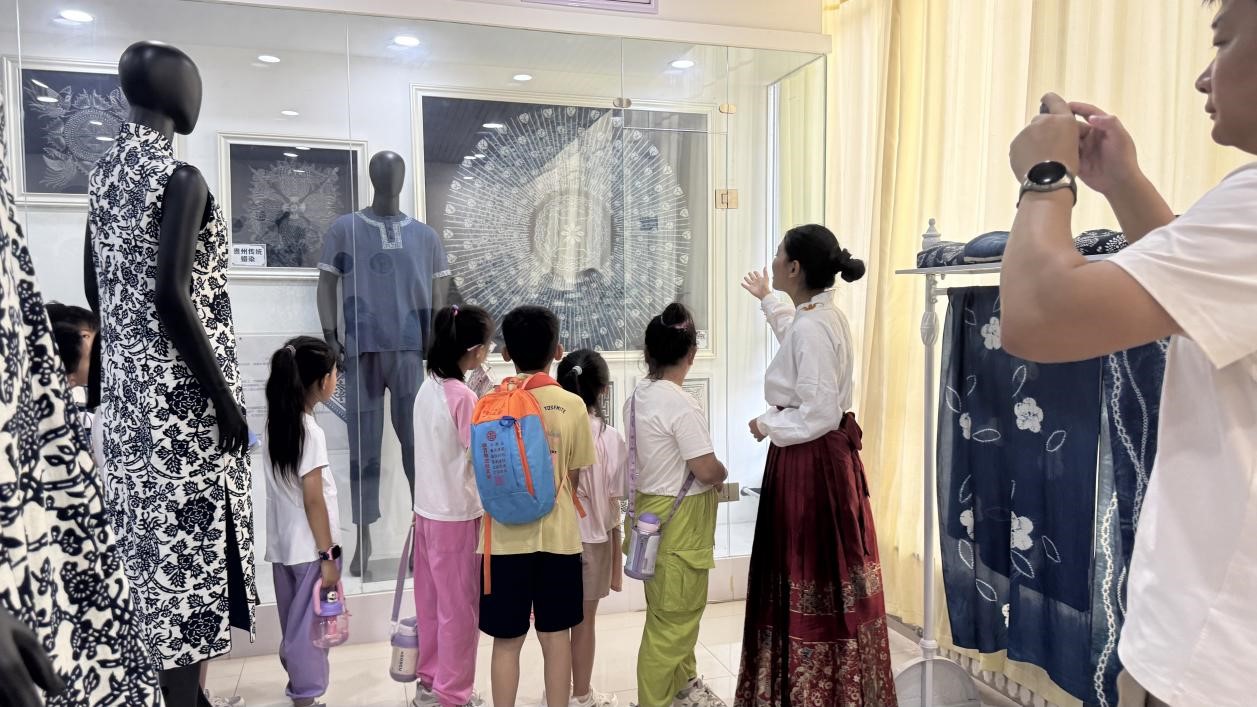 活动伊始,小记者们在员工讲解员带领下,开启纺织文化奇妙之旅。小记者们先后参观了面料展室、齐鲁服饰展室、染缬艺术展室、服装展室、鲁锦展览馆等展厅。小记者们紧紧跟着讲解员,走进各个展室,轻轻触摸各类面料,感受到纺织面料之美。讲解员在面料展室为小记者们详细讲解了各种新型绿色环保材料和功能纱线产品。随后小记者们在染缬展馆看到了由公司师生共同制作的造型精美、工艺精湛的艺术作品,了解到了灰缬、绞缬、夹缬、蜡缬四大类染缬技术,同时还参观了以鲁锦为主题的展馆,在精美的鲁锦制品及民间收藏艺术品中深刻感受到了鲁锦之美。展馆中的展品,不论是多彩的功能性面料织物,还是绚丽的蓝白染缬工艺品,都激发起了小记者们对传统纺织文化的浓厚兴趣,鲁锦柔软舒适花纹斑斓精致,更是让小记者们在开阔眼界的同时感受到纺织文化的别样魅力。